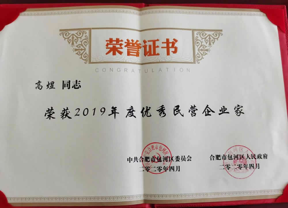榮獲“2019年度包河區(qū)優(yōu)秀民營企業(yè)家”稱號(hào)